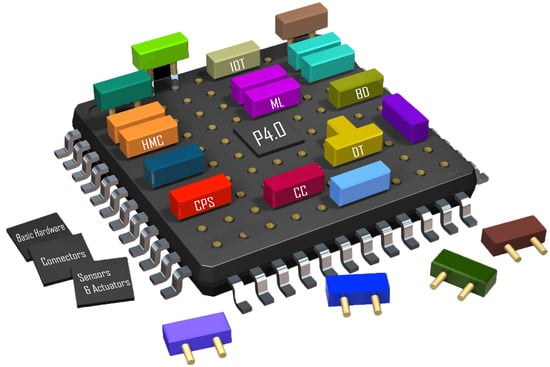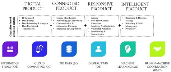 In the I4.0 era, products and their individual components have the potential to ’interact’ with other systems due to their inherent capabilities. However, the application of I4.0 technologies can significantly enhance these interactions. The extent of this improvement is contingent upon the capabilities embedded within the product and its components. These technologies include the Internet of Things (IoT), Cloud Computing (CC), Big Data (BD), Digital Twin (DT), Machine Learning (ML), Human–Machine Cooperation (HMC), and Cyber Physical Systems (CPS) (see Figure 1).