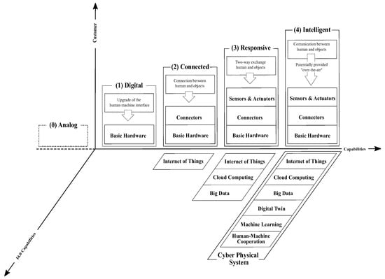 Despite the widespread adoption and interest generated by smart products, scientific studies have comprehensively addressed the aspect of what makes a product “smart”. The work of Raff et al. [13] stands out in this area for its relevance and pertinence to the objectives of the present study. The authors identified the key characteristics and capabilities that define smart products. They outlined a set of criteria that highlight the benefits and implications of such products, and proposed a hierarchical framework for classifying and categorizing different types of smart products based on these identified characteristics. This framework presents four distinct archetypes, each characterized by specific software and hardware functionalities closely linked to the aforementioned criteria. The division into archetypes allows for the increased complexity of products, providing a structured and clear view of the various existing types. This taxonomic approach significantly contributes to a better understanding and categorization of smart products, fostering further research and development in the field. In continuation of this work, we will rely on the study conducted by Raff et al. [13] and use their framework as a starting point to further analyze smart products in the context of the new innovative technologies present in I4.0.
