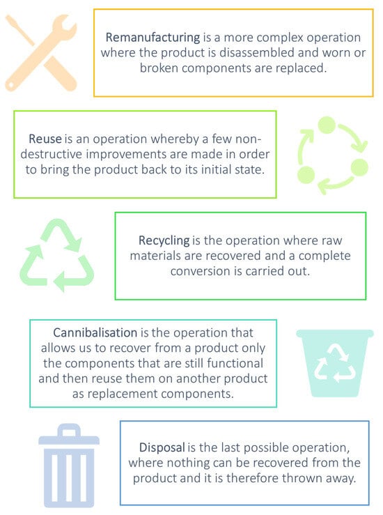 The last two recovery options in our framework—cannibalization and disposal—unlike the others, are simpler and do not require an in-depth literature review. Specifically, cannibalization is defined as the operation that allows us to recover from a product only the components that are still functional and then reuse them on another product as replacement components. On the other hand, we will refer to disposal as the last possible operation, where nothing can be recovered from the product and it is, therefore, thrown away.