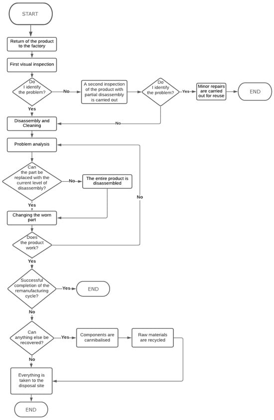 Figure 5 provides an example of a recovery process for a typical, standard product. As depicted in Figure 5, upon the return of the product, the recovery process initiates with an extensive phase of inspection and problem identification (first visual inspection). This crucial phase involves a meticulous examination of the product and its constituent parts to detect any malfunctioning components or systemic failures. If the problem is not solvable with a visual inspection, the product disassembly stages are undertaken, growing progressively more invasive to grant access to the internal component and verifying one by one if they are involved in the malfunction. After identifying the problem, the process focuses on resolution through the replacement of the faulty component. This may involve removing damaged or non-functional parts and replacing them with new or repaired components. However, if the product continues to malfunction despite component replacement, the process diverges into a different cycle. In this phase, the problem is reanalyzed to identify the true cause of the malfunction. If necessary, the process may return to product disassembly to further examine the components and resolve the issue.