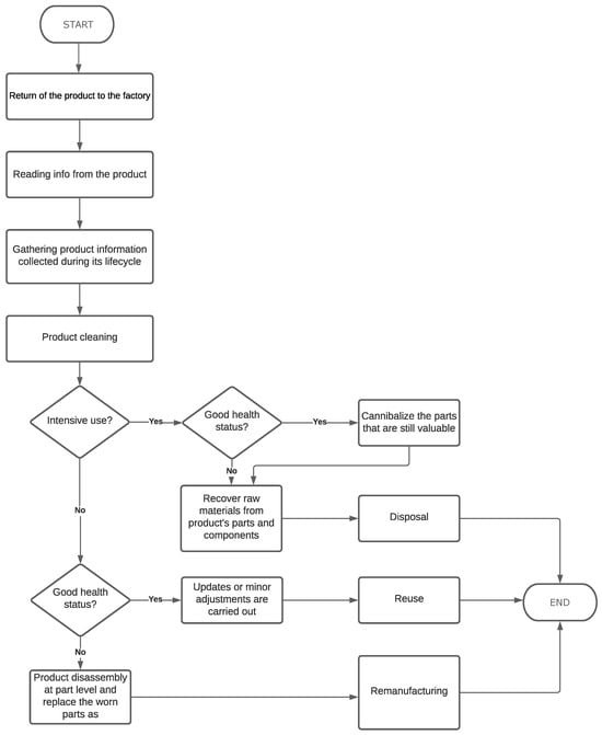 We now turn our attention to the proposed flowchart for EoL management, which incorporates innovative tools for product recovery (refer to Figure 6). As already mentioned above, in the context of P4.0, the adoption of I4.0 tools and technologies can expedite various stages of the recovery process, relative to conventional products. A P4.0, operating within a smart environment, has the capacity to amass detailed health status data, even prior to returning to the factory for recovery.
