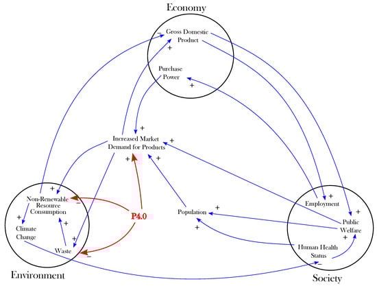 The economic dynamics of P4.0 are captured in the reinforcing loops that demonstrate how initial adoption can catalyze broader economic benefits. The diagram illustrates how P4.0 stimulates economic growth through multiple pathways: by fostering innovation, creating new market opportunities, and generating employment. These positive feedback loops show how increased production and adoption of these advanced products generate higher aggregate expenditures, which in turn enhance purchasing power and public welfare. This is particularly evident in the reinforcing loops connecting market demand to Gross Domestic Product (GDP) growth, employment, and purchasing power. While economic incentives such as subsidies may be necessary to initiate these reinforcing loops, particularly in lower-income segments, the resulting economic growth creates opportunities for reinvestment in sustainability-enhancing technologies.