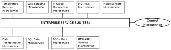 Therefore, to implement this roadmap, the required computational resources must be able to deal with big data by running them into simple hardware computers. To ensure these objectives, a decentralized structure is required [52] to support scalability [53]. Therefore, an enterprise service bus (ESB) was chosen to enable this structure in contexts of low computing capacity, such as fog computing at the edge of the cloud. This is an innovative approach because using the concept of scalability allows for the aggregation of several microservices with specific functionalities to connect several clusters. Figure 2 shows the block diagram, wherein several distinct clusters are easily aggregated to their basic structure; for simplification reasons, the acronym for this new tool is AIFC (algorithmic ignitor to fog computing). The AIFC is composed of a set of microservices integrated into an ESB, as shown in Figure 2, such as temperature sensors, web scrapers, IA cloud connection, ML-KNNs, noise sensors, data transformation, SQL data, JSON data, and BME-280 sensors. A pseudocode example (all codes can be freely accessed) is presented in Table 2.