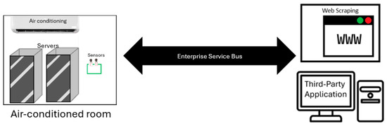 The first step, the PoC, was carried out in an environment with the need for adequate temperature control due to the equipment located there. Around 3000 people work in this facility’s network every day. Therefore, a proof-of-concept test was conducted, wherein an array of NTC sensors was assembled to measure the temperature at the location, as shown in Figure 3, which was connected to the initial bus structure to verify whether it met and behaved as initially expected. The sensor array was connected to a system with a low-cost microcontroller with a wi-fi module, which allowed the data measured from the environment to be sent to the data filtering microservice (Figure 3). From there, the data were sent to the processing and data storage microservices. With the sensor matrix connected to the initial model of the corporate service bus, two new microservices were created to facilitate data analysis and decision-making: the first microservice allowed for communication with third-party software, whether developed by third parties or using established tools such as Microsoft® Excel, to generate graphs showing the temporal evolution of the temperature in the room environment and the second microservice scraped data from a website that provides real-time climate information. In this case, it was possible to compare the difference in the temperatures between the internal and external environments without having to create new sensor matrices to assess the temperature limit tolerance applicable to the equipment inside the room. To test the functionality of this proof of concept, two tests were performed. The first test was the creation of an application that communicated with the bus microservice, created for this purpose, and that displayed a real-time graph with the data obtained in the communication. The data obtained in the application had already been formatted, processed, and stored by the microservices made available in this version of the bus. Therefore, the purpose of the second test was to verify whether the same communication behavior as that of the microservice that provided data via the bus allowed communication with established third-party tools. Communication was performed using Microsoft® Excel, and the graphs were subsequently generated in the spreadsheet.