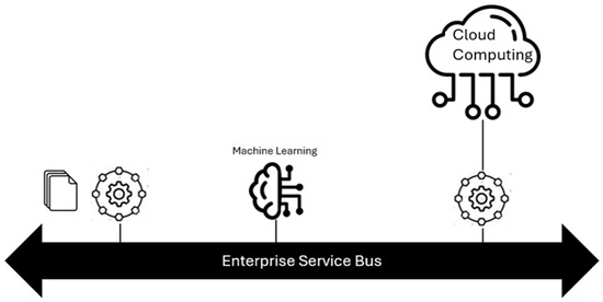 As shown in Figure 2, the AIFC uses the ESB, acting as the basic infrastructure for fog computing. The bus was developed to connect microservices that allow for solving problems for different stakeholders, minimizing the main limitations of cloud computing: processing availability and latency. As the microservice structure allows for availability and scalability, the bus contains a control that allows access to third-party applications and communication between the microservices on the bus itself. In terms of scalability, data processing microservices were coupled to the bus for format compatibility, data storage in relational and non-relational formats, the data processing of large masses of data made available in file formats or directly from websites, communication with cloud services for training machine learning engines, and image analysis.