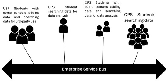 The cycle started in the first step, wherein a treatment similar to that carried out in the department of a small company was initiated, and new studies were carried out, emulating other environments in small companies; the fourth step extended the study to a decentralized format, as in several cases in the state of the federation where this study was conducted, where a company can have a department (such as logistics distribution) in one city and other departments (such as maintenance) in other cities; therefore, the scalability of the microservices for processing data from sensors was expanded. Based on a structure created by a professor and students from the CPS, a microservice was created and then added to the ESB that is capable of filtering, formatting, and processing data from an environmental sensor that is able to detect pressure, temperature, and humidity. The microservice was tested with a previously collected database and was offered to other CPS students so that they could use it on the bus. In this case, a replica of the measurement station was created, which allowed students to perform real-time analysis, as well as the data that were sent to the SQL storage microservice. CPS students, under the supervision of a professor, simultaneously accessed the bus services, making queries and analyzing data, simulating real-time environmental decision-making. Another three students who were also from the CPS used the data that were collected over several days and subjected them to tools and analyses, such as regression analysis, which produced climate condition forecasts for future periods. Continuing the scalability phase, a microservice for processing noise sensor data was developed and coupled to the bus, which allowed for the acquisition, filtering, and subsequent analysis of noise data in various environments at the USP. This format allowed for sending and consulting data in real time over several hours of a given day to assess the noise conditions in the rooms and in the external work environment. Then, data stored in the SQL storage microservice could be consulted and plotted on a graph with third-party applications, showing a temporal analysis of the noise evolution. This phase allowed us to evaluate the capacity to couple new microservices to the bus while maintaining the capacity to work at the edge of the cloud. It proved to be increasingly suitable for the modularity characteristic of I4.0, as well as for interoperability. Figure 5 presents the context of the fourth step.