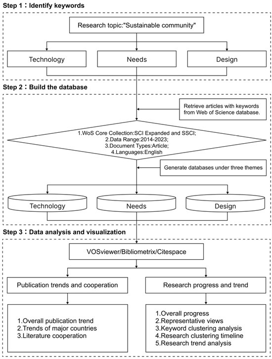 As illustrated in Figure 2, the framework comprised several stages: data collection, preprocessing and cleaning, bibliometric analysis, cross-validation and comparison, interpretation and synthesis, reporting, and dissemination. First, the research directions for sustainable community perspectives were identified as follows: technology, needs/demand, and design. Second, searches were conducted on the Web of Science (WoS) to obtain databases of papers related to these three topics. Finally, the data were imported into VOSviewer, Bibliometrix, and CiteSpace for visual analysis to derive current research findings regarding sustainable communities from the three aforementioned perspectives.