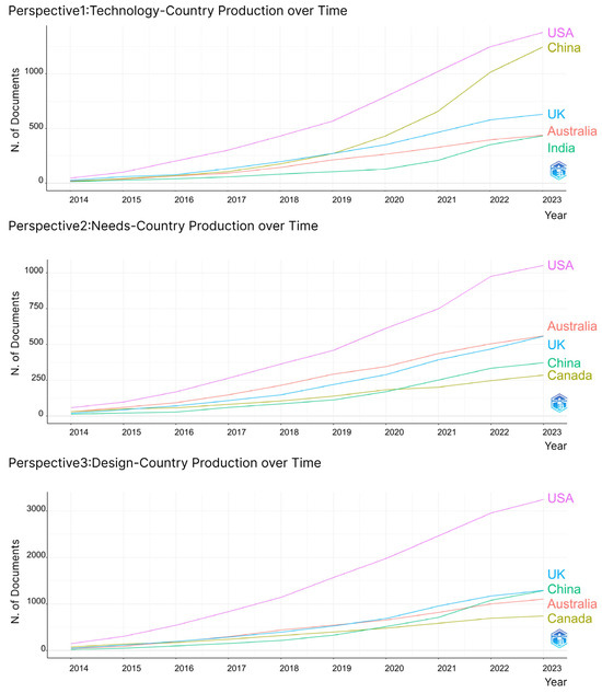 Figure 4 illustrates the distribution of the top five countries in terms of the numbers of publications related to the technology, needs/demand, and design perspectives. From the technology perspective, the leading countries are the USA, China, the UK, Australia, and India. The USA stands out with a substantial number of publications, exceeding 1000 in 2021. This indicates that the USA maintains a high level of research output in the field of sustainable community technology. China’s publication count has consistently increased, surpassing the UK in 2019, which suggests that China is placing significant emphasis on the technical aspects of sustainable communities, highlighting its potential for future research breakthroughs. From the needs perspective, the top five countries are the USA, Australia, the UK, China, and Canada, in that order. Notably, China surpassed Canada in the number of papers published in 2021. This ranking indicates that the USA places considerable emphasis on the demand aspect of sustainable communities, while the UK and China are gradually increasing their research investment in this area. From the design perspective, the leading countries are the USA, the UK, China, Australia, and Canada. The USA remains significantly ahead in terms of the number of publications, while the other four countries exhibit similar publication counts. China has experienced substantial growth in this area, with the number of papers published in 2023 nearing that of the second-ranked country.