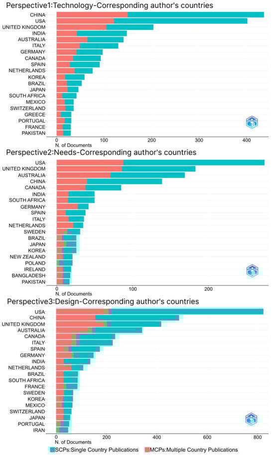 Countries of the corresponding authors of research articles from the perspectives of technology, needs and design.