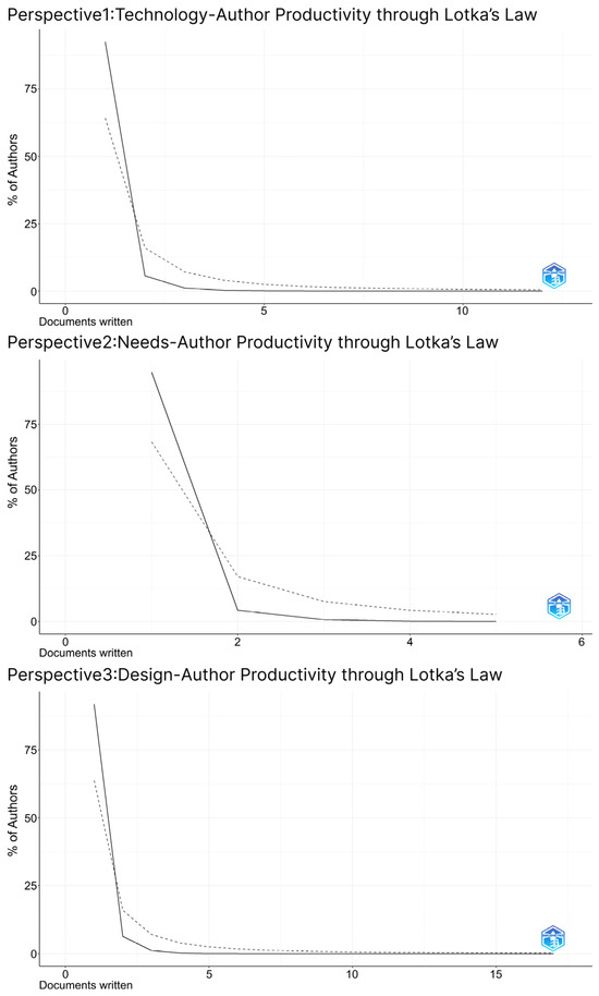 Lotka’s law is a power law that describes the frequency of scholarly publications [16]. In Figure 7, the horizontal axis represents the output of articles and the vertical axis represents the proportion of corresponding authors. Under the “technology perspective”, 12,684 scholars participated in research into sustainable communities, including 11,743 authors who contributed to a single article, accounting for 92.6% of the total. Thirty-eight scholars participated in 5 or more articles, including five scholars who contributed to 10 or more articles in the field. The results show that most scholars in the field of sustainable community technology are relatively new, but a few have published more in-depth research results. From the “needs/demand” perspective, 7681 scholars participated in the research, with 94.9% publishing one article and only one scholar publishing five or more. This suggests that research in this field is still in its infancy. From the “design” perspective, 21,527 scholars participated in the research, with 91.9% publishing one article. Fifty-one scholars published 5 or more articles, and one scholar contributed to 17 articles, indicating more in-depth research in this field. Overall, most of these scholars have engaged in sustainable community research to some extent, but the number of scholars deeply invested in research is relatively small, and the number of scholars involved in subsequent academic output is lower than expected.