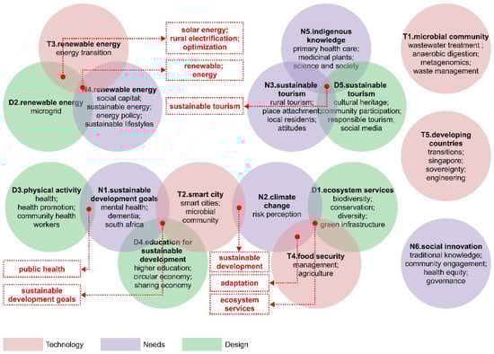 Table 2 presents keyword clusters related to sustainable communities from the perspectives of technology, needs/demand, and design. The technical topics include microbial communities, smart cities, renewable energy, food security, and challenges faced by developing countries. The demand perspective emphasizes sustainable development goals, climate change, sustainable tourism, renewable energy, indigenous knowledge, and social innovation. The design perspective encompasses ecosystem services, renewable energy, physical activity, education for sustainable development, and sustainable tourism. A comparison of research topics across these clusters (Figure 8) revealed intersections among the technology, needs/demand, and design perspectives. The red clusters in Figure 8 represent technical perspectives, while the purple and green clusters correspond to demand and design perspectives, respectively. Notably, sustainable development goals, ecosystem services, and renewable energy have been common research topics across all three perspectives. Additionally, sustainable tourism and public health have been addressed from both the needs/demand and design perspectives, whereas sustainable development and adaptation are prevalent in the research from both the technological and needs/demand perspectives.