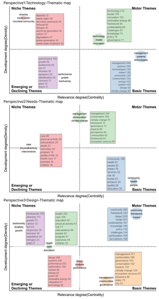 In Figure 10, the first quadrant represents motor themes (important and well-developed), the second quadrant represents basic themes (highly developed and isolated), the third quadrant represents emerging or declining themes (marginal), and the fourth quadrant represents niche themes (important but not well developed). In relation to sustainable communities, technology and innovation are important research topics with strong development. By contrast, diversity, wastewater, and the microbial community are highly important but remain marginal and underdeveloped. Management-, systems-, and technology-related topics exhibit the best development status, while research into performance, growth, and biodiversity has garnered the least attention and development. Furthermore, sustainable community demand, management, conservation, and climate change are the most relevant and important topics. Community, health, and people represent well-developed basic topics, while care, physical activity, and interventions are the least valued. In sustainable community design, community, framework, and impact are important and well-developed topics, whereas management, communities, and governance are basic themes with good development status but lower importance. Finally, design, systems, and performance are marginal themes, while topics related to health, caring, education, biodiversity, diversity, and growth are not highly developed.