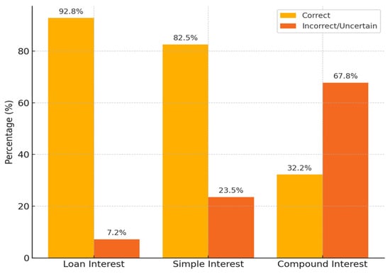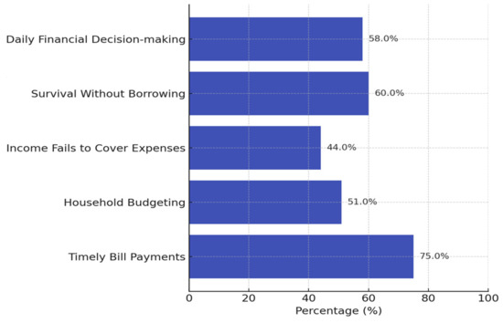 The financial literacy component of the survey was adapted from established scales, such as the OECD/INFE Financial Literacy and Financial Inclusion Survey [2,20]. This instrument includes questions to assess core financial concepts and practical skills, enabling an evaluation of respondents’ understanding of interest rates, inflation, and financial planning.
