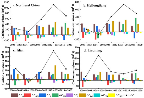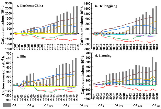 Factors driving agricultural carbon emissions in northeast China (Figure 2a) were found to be consistent with previous research results [19]. The output scale effect (∆CG) was the primary factor leading to an increase in agricultural carbon emissions, and ∆CG increased agricultural carbon emissions to 15.58 million tons. In addition, we found that ∆CF followed ∆CG closely (with an accumulated 6.53 million tons of agricultural carbon emissions). However, ∆CF was surpassed by ∆CPCI in 2017. Additionally, ∆CFCI acted as a factor in inhibiting agricultural carbon emissions during most of the study period; however, it became a driving factor of agricultural carbon emissions after 2019, contributing 2.70 million tons until 2020.
