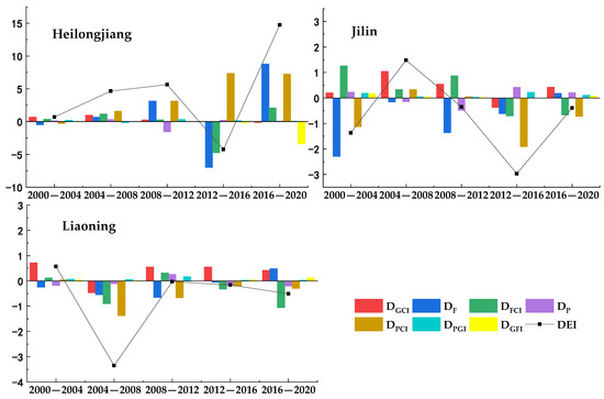 According to Equation (13) for the DEI, Table 3 shows the decoupling efforts of grain production in northeast China in five stages. During 2000–2020, except for the growth of carbon emissions due to the scale of agricultural output, the decoupling efforts of grain production in northeast China experienced “weak decoupling → weak decoupling → no decoupling → no decoupling → no decoupling”. During 2000–2004 and 2004–2008, the overall DEIs were 0.33 and 0.58, respectively, thus reaching weak decoupling efforts and suggesting that agricultural emission reduction efforts during these periods could offset the growth of carbon emissions because of the growth of the agricultural economy. The overall DEIs for the periods of 2008–2012, 2012–2016, and 2016–2020 were negative, thus indicating that efforts to reduce agricultural carbon emissions have been ineffective under the leading guidance of increasing grain production since 2008.