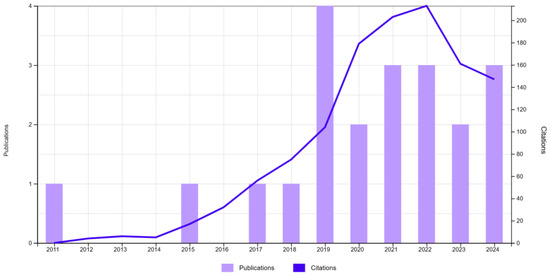 Publication and citation trends concerning the importance of online reviews in the decision-making process for accommodation booking are illustrated in Figure 1. This figure indicates an upward trend in both publications and citations in recent years, reflecting an increasing academic interest in this area of research. Between 2011 and 2014, there were very few publications, with a notable peak observed in 2019, signalling a surge of interest at that time. The relatively stable number of publications in more recent years suggests potential gaps in the literature, highlighting opportunities for new studies to explore under-researched aspects of online reviews within the hospitality industry. Additionally, while citations began at a low level, they have steadily increased, peaking at around 200 in 2022, demonstrating the growing influence of these studies.
