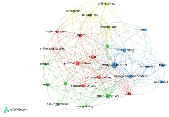 A consistency analysis was performed using VOSviewer on keywords that appeared more than three times, resulting in the identification of eight key terms. VOSviewer, a free Java-based software developed by Van Eck and Waltman [24], is specifically tailored for bibliometric analysis and excels in visualizing co-occurrence networks as well as mapping trends in scientific research [24]. In this analysis, each node represents a keyword derived from the reviewed articles, with the size of the node reflecting its frequency of occurrence. As illustrated in Figure 2, larger nodes correspond to more frequently used keywords, indicating areas of heightened focus within the literature. By mapping the most common and co-occurring keywords, VOSviewer offered a clear visualization of the thematic structure and the interconnections between key concepts related to the importance of online reviews in the decision-making process for accommodation booking.
