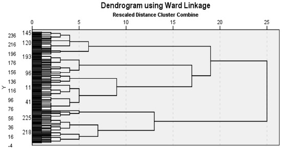 Hierarchical cluster analysis was conducted using “Ward’s method” to create compact clusters by minimizing the total variance within them. Then, the “Euclidean” distance measure was applied, which is the standard for cluster analysis. The “Dendrogram” option was enabled to visualize the hierarchical structure and determine the optimal number of clusters, based on the largest vertical gap between dendrogram levels. The optimal number of clusters was identified by the most significant vertical gap.
