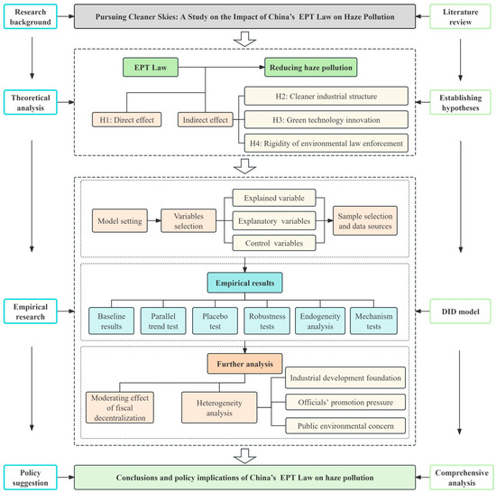 The structure of the following sections is as follows: Section 2 reviews the policy background and develops the research hypotheses, examining both the direct and indirect mechanisms through which the EPT Law impacts haze pollution. Section 3 outlines the methodology and data, providing a detailed explanation of the model settings and variable selection. Section 4 presents the empirical results. Section 5 focuses on further analyses, including tests for heterogeneity and moderating effects. Conclusions and policy implications are provided in Section 6. The overall research framework is shown in Figure 1, offering a visual summary of the study’s components and flow.
