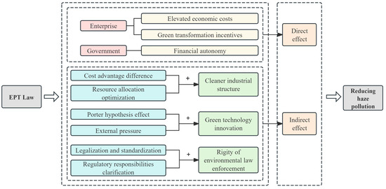 According to the above analysis, Figure 2 illustrates the influence mechanism between the EPT Law and haze pollution, highlighting both direct and indirect pathways for reducing haze levels.