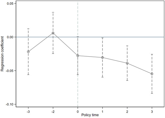where represents the dummy variable for the year of implementation of the EPT Law. When n < 0, it signifies the pre-implementation period of the policy; when n = 0, it represents the current period of policy implementation; and when n > 0, it indicates the post-implementation period. This study utilizes the period immediately preceding the policy implementation as the base period to analyze the dynamic trend changes in cities before and after its enforcement.