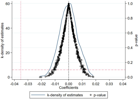 Despite controlling for both city and time fixed-effects in the benchmark regression, unobservable city-specific factors may still impact the research findings. To address this issue, following La Ferrara et al. [59], this study employs a placebo test by randomly generating samples for the treatment group. Specifically, the explanatory variable Reform × Post is randomly reassigned to construct a “pseudo-policy dummy variable”, and the process is repeated 500 times for regression analysis using Model (1). The resulting observations are shown in Figure 4. It is evident that the randomly generated, erroneous coefficient estimates are mostly clustered around 0 and are statistically insignificant, sharply contrasting with the actual benchmark regression coefficient estimate of −0.0353. This finding suggests that unobservable factors do not exert a significant influence on the policy effects, further enhancing the robustness of the results.