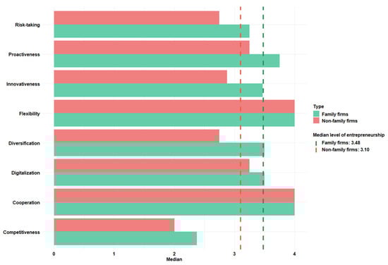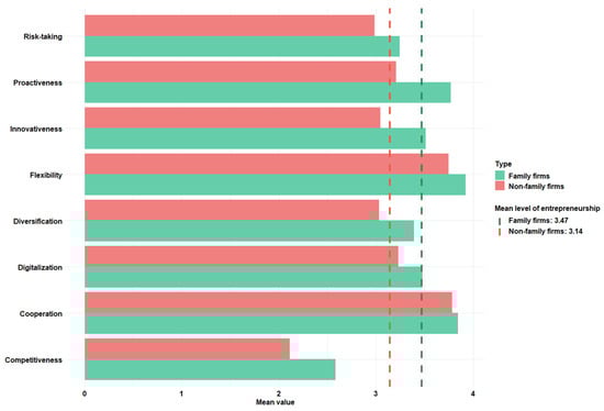 The research question was consistent with the identified research gap. Previous studies have compared family and non-family businesses in terms of their levels of entrepreneurial orientation as a three-dimensional construct [7,9,26,27,28], a five-dimensional construct [29,30,31], entrepreneurship [32], or entrepreneurship strategies [33]. However, the research has been limited to a small number of dimensions that make up the main construct. The novelty of our study is the complex multidimensional approach where the entrepreneurship construct consists of eight dimensions. This allowed for a more comprehensive and holistic analysis of the elements that make up the internal entrepreneurship of the organization. Considering the variety of approaches toward organizational entrepreneurship that take various entrepreneurial criteria into account, we believe that a complex and multifaceted approach has significant scientific value due to the possibility of capturing the differences in the individual dimensions and introducing improvement actions. Additionally, comparing family and non-family businesses in various dimensions of entrepreneurship allowed for us to take the specificity of these businesses into account and develop management tools in a conscious and effective way in order to ensure sustainable economic development.