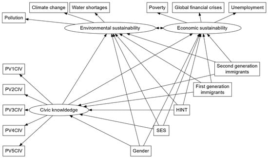 Figure 1 presents the SEM model constructed for this study. This model represents the relationships between civic knowledge (measured by five plausible values), the aforementioned sustainability constructs (environmental and economic sustainability, together with their corresponding indicators), and background factors (gender, immigration status, SES, and parental interest in political and social issues).