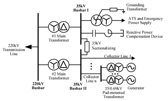A typical simplified diagram of a centralized new energy station with a voltage level of 110 kV and above is shown in Figure 2 [20]. It includes the following components: