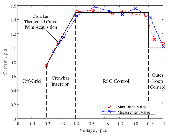 Using actual fault waveform data of DFIG and selecting the stator current limit to be , different sets of DFIG terminal current and voltage data can be obtained by adjusting the transient resistor value in the simulation. When the Crowbar is activated, an arbitrary set of DFIG terminal current and voltage data can be used to calculate the proportion coefficient in Equation (2), which is found to be 3.73. With a stator current limit of , the short-circuit current under RSC excitation control can be obtained. To more accurately characterize the fault characteristics of DFIG, the maximum current under Crowbar operation is taken as the stator current limit under RSC excitation control. From this, the critical voltage of Crowbar operation and RSC excitation control = 0.402 p.u. Furthermore, applying the plotting method, the I-U characteristic curves of the DFIG waveform data and simulation data can be obtained, as shown in Figure 3, where the current and voltage are per-unit values.
