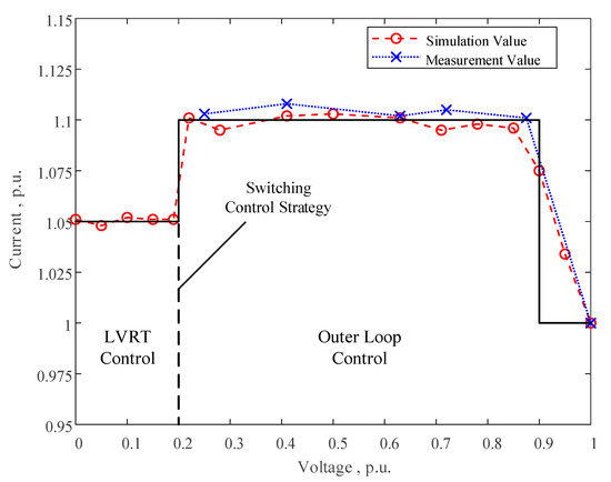 For PV systems, when the grid-connected point voltage , the expression for the short-circuit current is similar to that of the Permanent Magnet Synchronous Generator (PMSG), and it will not be elaborated here. When the voltage , the PMSG allows disconnection from the grid, while the PV system needs to maintain continuous operation without disconnection for 150 ms and provide more reactive current to the grid [24]. According to the LVRT control requirements, the current command is modified as follows: