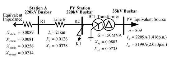 Taking the 220 kV PV power station in Province G as an example, the station is connected to the main grid 220 kV LP station through the 220 kV B-line (positive sequence impedance of 6.8 Ω). The basic parameters include the equivalent positive and zero sequence reactances of the main grid in both big and small modes, the length and the positive and zero sequence reactances of the interconnection line (B-line), as well as the capacity of the B#1 main transformer and the positive and zero sequence reactances. Refer to Figure 6, where the reactances are given in per unit (p.u.), and the base capacity is 100 MVA.