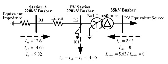 Based on the calculation method proposed earlier, the short-circuit calculation is performed on the PV power station B shown in Figure 6. The calculation for the A-phase fault at K1 point under big mode is presented, while other modes, locations, and fault types are omitted in this paper. Considering the influence of the PV power output angle on the short-circuit current, two extreme cases, φ = ±90°, are calculated separately.