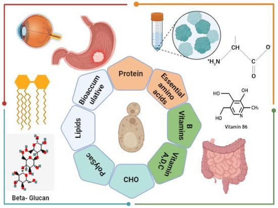 Under optimal conditions, S. cerevisiae can accumulate significant quantities of trace elements critical for pharmaceutical and nutritional applications, such as selenium, zinc, chromium, and β-glucans (Figure 2). These elements have been extensively studied for their health benefits. For instance, zinc-enriched yeast has shown potential in mitigating age-related diseases like cancer and macular degeneration [59,60]. Similarly, chromium-enriched yeast biomass has been found to regulate blood glucose levels and improve insulin sensitivity in diabetic patients [61]. Additionally, β-glucans and selenium are noted for their antioxidant, immunomodulatory, and anticancer properties, particularly in protecting against colorectal cancer [62,63].