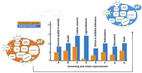 S. cerevisiae has been favored for industrial fermentation due to its physiological resilience in the face of challenging environmental conditions [111]. The discovery of Specialty S. cerevisiae strains may be advantageous for industrial fermentation processes, which subject yeast to a range of stressful factors, such as fluctuations in temperature, elevated ethanol concentrations, osmotic pressure, and ionic stress. These factors significantly impact yeast performance and fermentation kinetics [112]. Additionally, mainly at large scale, technical challenges such as temperature control are often avoided due to high costs, and contamination levels of lactic acid bacteria and wild yeasts are raised [113]. Thus, recent research has focused on enhancing yeast traits like osmotolerance, ethanol resistance, and tolerance to low pH and high temperatures to improve fermentation yields.