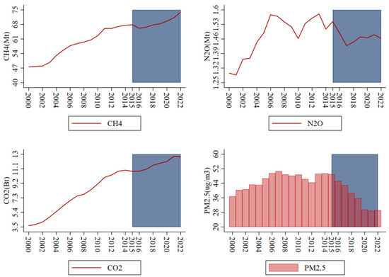 China’s economic transition provides an ideal setting for studying the sustainable development of polluting firms. On the one hand, resource conservation and environmental protection are central principles of ecological development promoted globally. On the other hand, developing countries, exemplified by China, have yet to complete their modernization and industrialization goals, requiring environmental policies to balance corporate production efficiency with stable economic growth [8]. In the early 21st century, the average daily concentration of fine particulate matter (PM2.5) in China exceeded 40 µg/m3, four times higher than the World Health Organization standard. The frequent occurrence of pollution incidents has made environmental issues a primary public concern in China [9]. In response to the growing pressure for environmental governance, the “Environmental Protection Law of the People’s Republic of China” (EPL) was officially enacted in 2015. The EPL has significantly altered the environmental risk landscape for polluting firms by increasing penalties and expanding the scope of environmental supervision. While controlling pollutant emissions (as illustrated in Figure 1, with the post-policy implementation period marked by the blue shading), it has also profoundly affected resource allocation in China’s capital markets and the operations of individual firms. Although polluting firms are major sources of environmental pollution, they also play a crucial role in the real economy due to their involvement in industries such as thermal power, steel, and cement—industries essential to both the national economy and public livelihoods [10]. Therefore, the implementation of environmental policy must be grounded in sustainability.