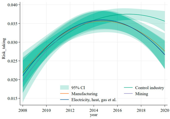 The descriptive statistics for the relevant variables are presented in Table 1. During the sample period, the mean risk-taking level of firms was 0.029, with a maximum of 0.196 and a minimum of 0.002. This indicates a significant disparity in risk-taking levels among listed firms in China. Moreover, the time series variations in risk-taking across industries also reflect significant differences in risk investment decisions (Figure 3). Furthermore, the mean risk-taking level of firms in major European countries had already reached 0.048 during the period from 1999 to 2007 [18], suggesting that the risk-taking level of Chinese firms remains relatively low. Additionally, the statistical descriptions of other variables are broadly consistent with existing research.