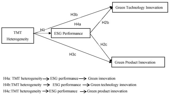 Based on upper echelon theory, both the innate features and the acquired experiences of the TMT jointly shape their members’ cognitive patterns and values. This, consequently, influences corporate behavioral decisions and strategic choices []. Moreover, the same issue can be approached differently by a highly heterogeneous TMT. This is because such a team has access to a richer array of decision-making resources and information. Diversity can also help mitigate biases within decision-making processes, as well as foster a more scientific approach to implementing ESG decisions []. According to Bilal et al. [], ESG can promote green innovation through enhancing corporate social responsibility and government procurement. The heterogeneity of a TMT is also reflected in the different experiences, knowledge reserves, and viewpoints possessed by the team members. This heterogeneity helps enterprises to consider ESG factors more comprehensively. They are also able to adopt a broader perspective in terms of analyzing the market environment and resource conditions required for implementing green innovation activities. Moreover, they can mitigate potential risks associated with green technological and green product innovations [].