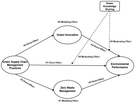Figure 1 presents the relationships among the study constructs. The current study used five constructs, i.e., GSCM practices, zero waste management, GI, GKS, and EP.