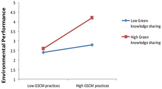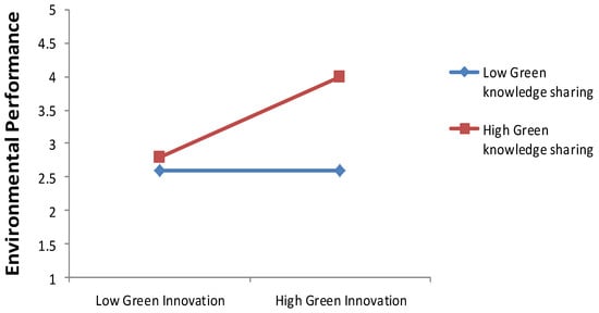 The present study also examined the moderating role of GKS on the link between GI and EP. Study H4 showed that GI has a positive role in EP. On the other hand, GI is concerned with the creation and adoption of novel methods that reduce the pollution, waste, and harmful emissions, and are necessary for the step-up of EP [44]. GI ensures the minimization of harmful materials and emissions through the adoption of green practices for the purchase, production, and distribution of product/services [43]. The GKS mechanism produces valuable information for the promotion of the ecological stance of the business organizations to protect natural resources and play a major role in the creation of innovative ideas for green practices [56]. The information and awareness about environmentally friendly business strategies promote the GI process, which is critical for the enhancement of the EP of the business organization [23]. GI practices executed by the business organizations with the support of green knowledge play a significant role in the protection of the natural environment [59]. The GKS mechanism provides support for the achievement of EP [53]. Therefore, we suggest that GKS plays a strengthening role for the connection between GI and EP.