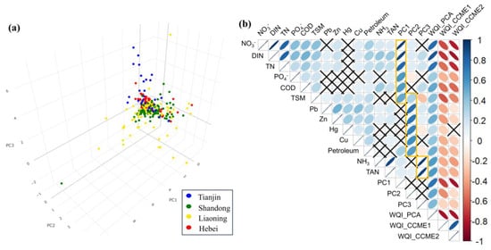(a) Loading plot of the first three components and (b) Spearman correlations between the 13 water quality indicators, the 3 PCs, and 3 WQIs.