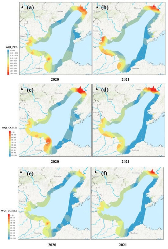 Spatial distribution of WQI in seawater: (a) WQI_PCA in 2020, (b) WQI_PCA in 2021, (c) WQI_CCME1 in 2020, (d) WQI_CCME1 in 2021, (e) WQI_CCME2 in 2020, (f) WQI_CCME2 in 2021.