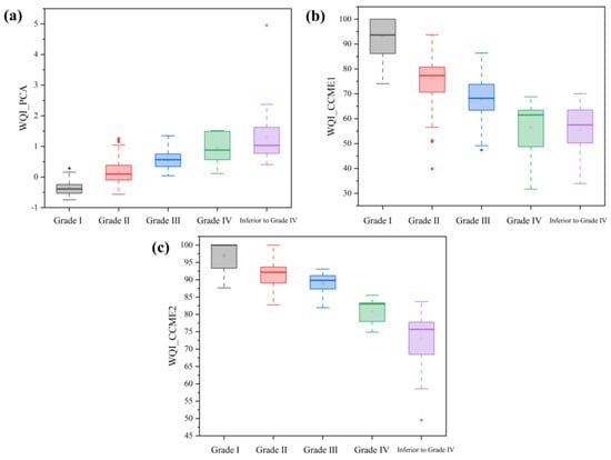 Box plot comparing (a) WQI_PCA, (b) WQI_CCME1, and (c) WQI_CCME2 across five water quality classes based on the univariate assessment method.