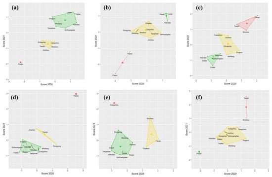 Figure 1a shows the PCA loading plot for the four provinces. To more accurately represent their spatial distribution, we further categorized the provinces into 13 cities and calculated the average WQIs for each city’s sampling points. Figure 3 displays the WQI scores for 2020 and 2021 across three methods, with cities grouped into three categories based on clustering results: high (green), medium (yellow), and low (red) water quality.