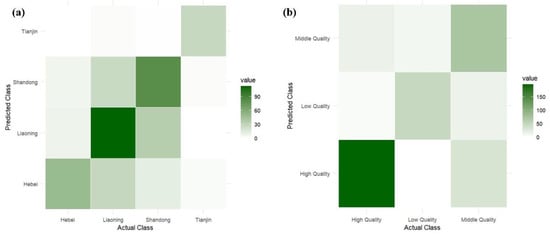 Comparison of confusion matrices for water quality classification: (a) by administrative regions and (b) by WQI_PCA categories.
