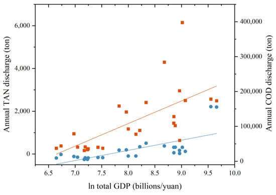 The relationship between ln total GDP and annual TAN discharge/COD discharge.