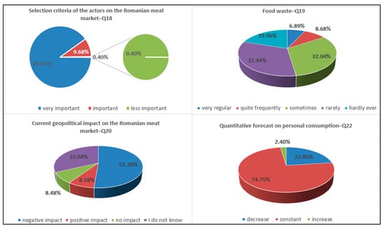 Around 80% of people spent more than 50 lei (about 10 euros) per week (on average/person) for the purchase of meat, but there is also the percentage of 20% who gave less than 50 lei (Q15). These aspects highlight that the environmental effects of higher meat consumption are more evident in higher-income households, according to the study in Chile [16]. It is obvious that meat consumption is closely linked to the income of the population, but also to fluctuations in global meat prices, which can influence food security [42].