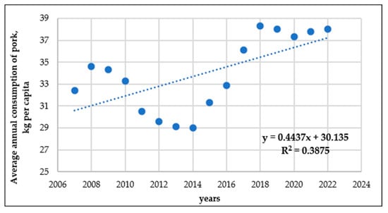 The results of the analysis of the average annual consumption of beef per capita showed its decreasing trend (Figure 4), possibly due to feed shortages, rising feed prices and energy costs, competition with pork and poultry etc. [35].