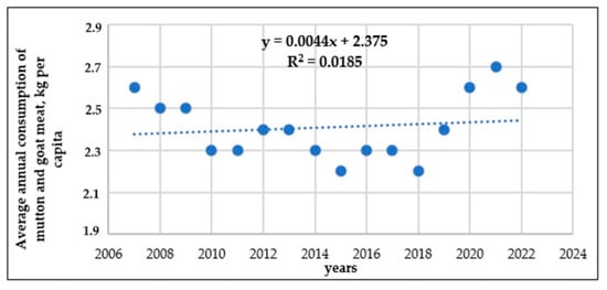 Regarding the average annual consumption of mutton and goat meat, there is an insignificant variation in the period 2007–2022 (Figure 6), as Romanians are not renowned consumers of this type of meat, which is consumed especially during the Easter holidays [37].