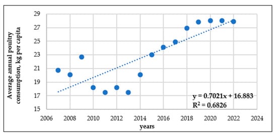 The average annual consumption of poultry had the most evident increase between 2007 and 2022, because poultry has a relatively low price, is white meat intended for consumers of all ages, is found in many diets and is easily tolerated (Figure 7).
